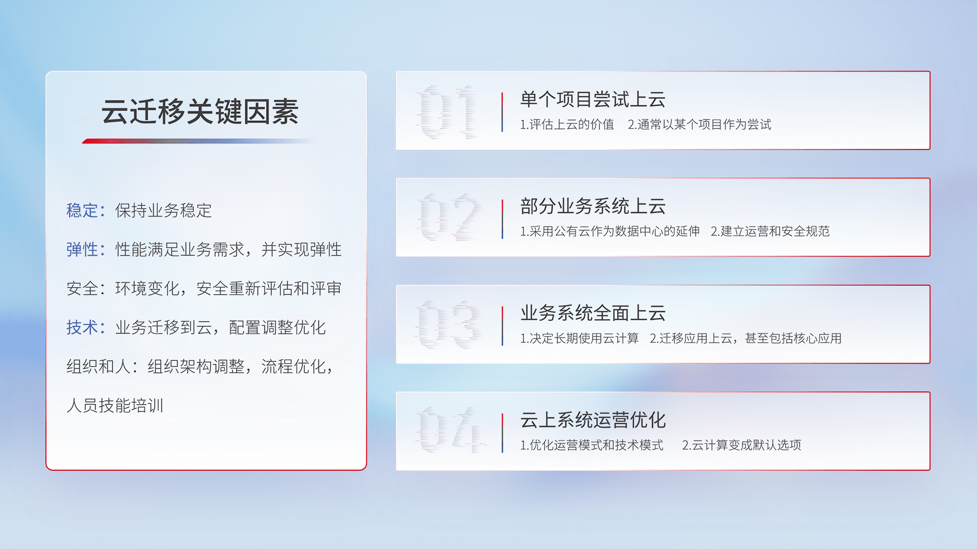 结合实际业务,,,从规划设计、、、云平台选型、、云原生改造、、、、数据迁移、、、、集成交付,,,,迁移全过程为客户识别最佳上云路径,,,,做好风险识别管理,,,,设计网络架构、、、、身份权限、、、、安全审计合规、、、操作审计、、日志审计、、监控告警策略、、、、多站点容灾设计等,,,对云上基础设施进行整体规划,,,,提升IT治理水平,,,以满足弹性、、、、高可用、、、高性能的需求。。。。