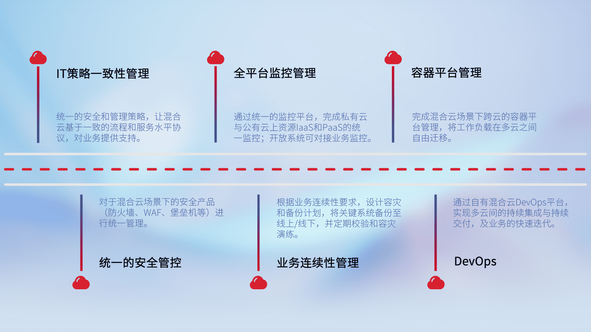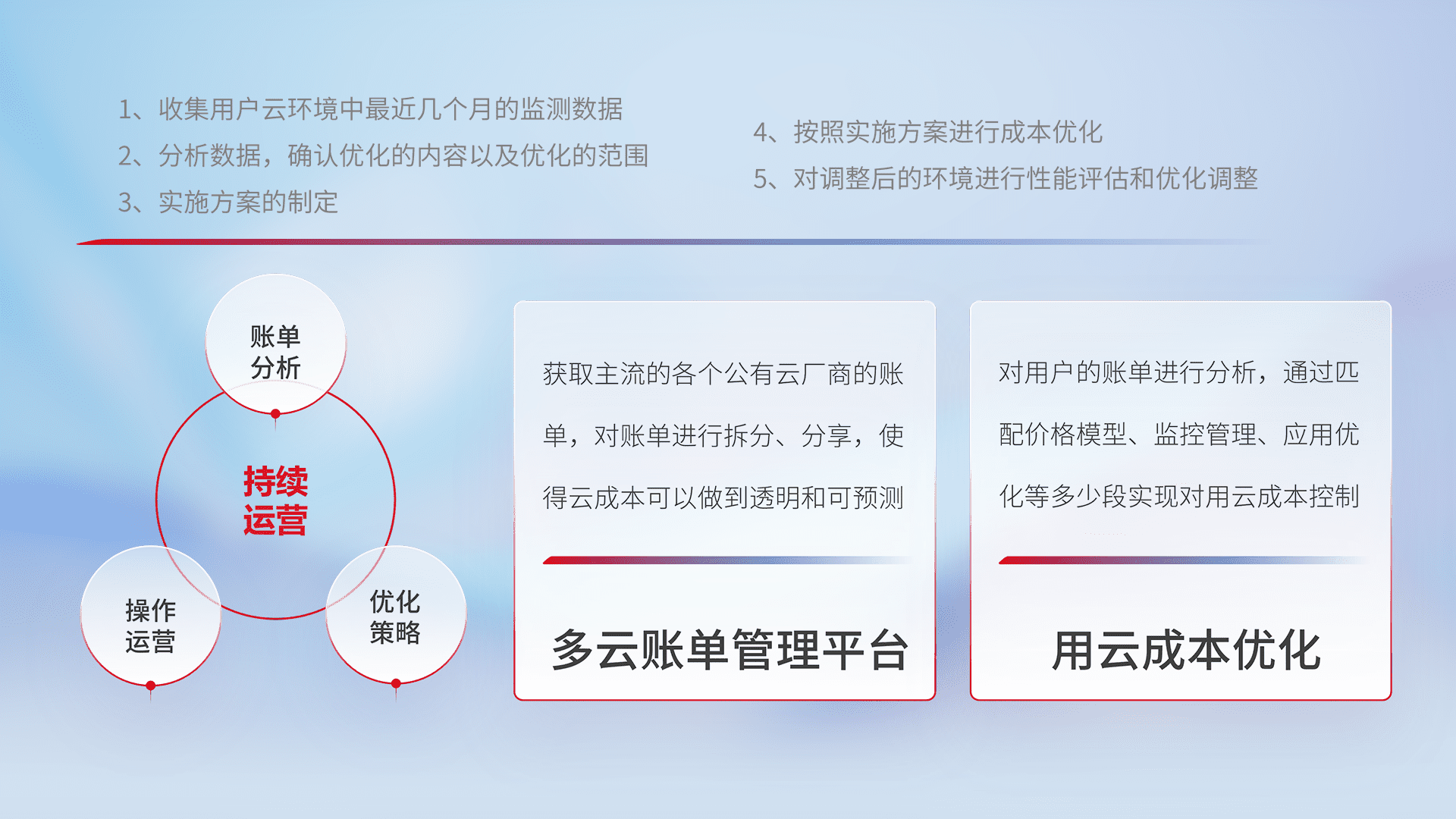 通过多云纳管,,,以统一的资源数据模型把客户的云资源进行抽象和封装,,,,进而实现对多云资源的统一操作,,保障云资源管理的可靠性、、稳定性与可用性。。。。量身定制化运维内容,,,,配置、、、、开发运维、、补丁管理、、、、备份、、、监控、、、认证和访问管理、、、审计和日常巡检等,,保障在用云过程中的可靠度,,稳定度以及高可用率。。