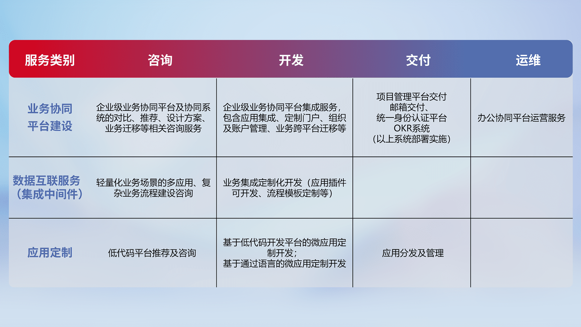 针对钉钉、、、企微、、、IDaas等平台级产品提供产品的规划、、、方案、、交付、、、定制化开发等服务,,实现如统一协同办公、、、、智能客户服务、、、、混合会议管理、、智能数据查询、、等业务场景,,实现数字化转型。。。